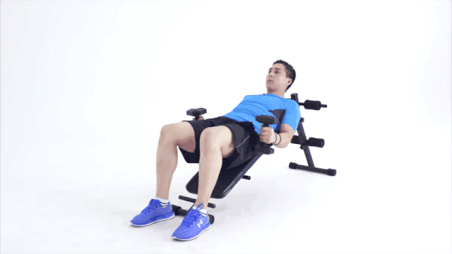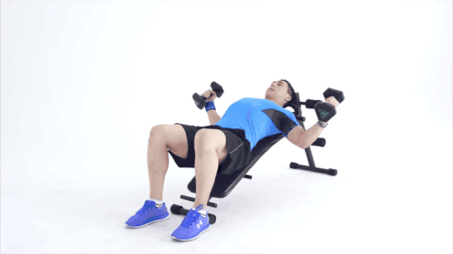 1.平躺於墊子上,啞鈴保持在胸前上推。