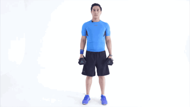 1.站直,啞鈴握在身體兩側。