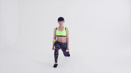 2.跨出單腳做弓箭步蹲動作,下蹲至膝蓋呈90度,後腳膝蓋會靠近地麵。